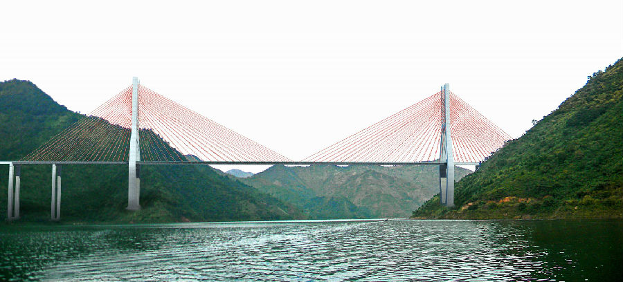 紅水河特大橋橋長956米,引橋設(shè)計(jì)為2×20米預(yù)應(yīng)力混凝土現(xiàn)澆箱梁,主橋設(shè)計(jì)為貴州岸邊跨213米,主跨508米,廣西岸邊跨185米的雙塔雙索面混合式疊合梁斜拉橋,結(jié)構(gòu)設(shè)計(jì)形式新穎。橋面寬27.7m,為雙向四車道高速公路。設(shè)計(jì)速度每小時(shí)80公里,總投資5.46億元,由廣西路橋公司承建。大橋在施工中利用斜拉橋主塔本身安裝纜索吊裝系統(tǒng),以纜索吊裝鋼主梁及疊合預(yù)制橋面板作為一種拉索體系,使橋梁受力更加合理化,施工更加便捷,相比傳統(tǒng)梁式橋、拱橋具有更大的跨越能力。