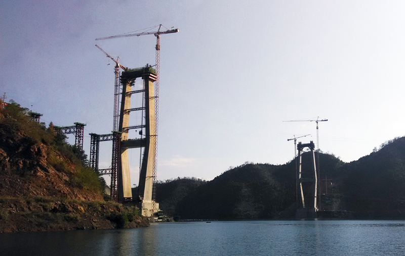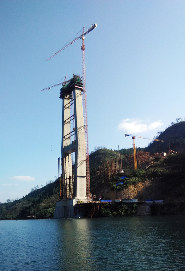 紅水河特大橋兩側(cè)橋墩高度均為210米,每個(gè)橋墩的起重機(jī)械配置均為川建生產(chǎn)的一臺C7036塔機(jī)、一臺C7030塔機(jī)和兩臺SC200/200WPZ中速變頻施工梯,副墩的施工機(jī)械為一臺P125平頭式塔機(jī)。 承擔(dān)主施工吊裝作業(yè)的C7036塔機(jī),最大起重量16噸,工作幅度為70米,C7030塔機(jī)最大起重量16噸,起升高度為220米,工作幅度為50米,兩臺塔機(jī)交叉式布置,覆蓋面大,C7036塔身斷面2.5米,主弦為圓鋼,C7030塔身斷面2米,主弦為角鋼,機(jī)構(gòu)配置均采用變頻無級調(diào)速系統(tǒng),啟動、制動平穩(wěn)。