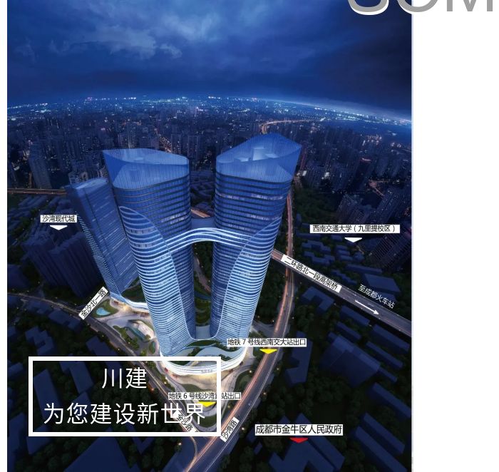 項目由3層商業(yè)裙樓(局部4層)及4棟超高層塔樓組成,最高塔樓高達243米,被譽為“摩天雙子塔,標(biāo)定時代天際線”、“新世紀(jì)·成都高端峰寓范本,當(dāng)代高階天幕藝術(shù)品,全球一線臻裝選材”,是成都市西北新地標(biāo)建筑。