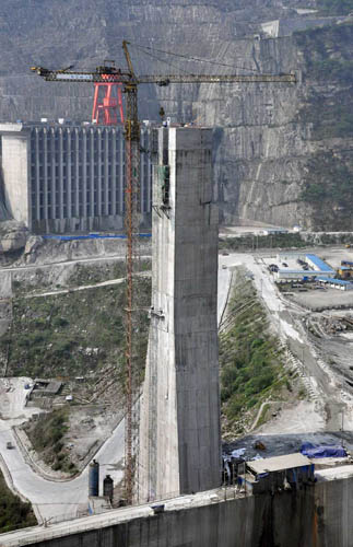 其中M1500塔機(jī)于2011年11月完成結(jié)構(gòu)安裝,投入使用。塔機(jī)全機(jī)總重量約650t,最大額定起重量65t,達(dá)到了港機(jī)的起重量,是國(guó)內(nèi)為數(shù)不多的超大型水平臂塔機(jī)之一,并創(chuàng)造了向家壩工地塔機(jī)吊重之最。由于水平臂塔機(jī)比超大型動(dòng)臂式塔機(jī)工作效率高且覆蓋面積更大,所以大大提高升船機(jī)標(biāo)段混凝土澆筑入倉(cāng)速度。
